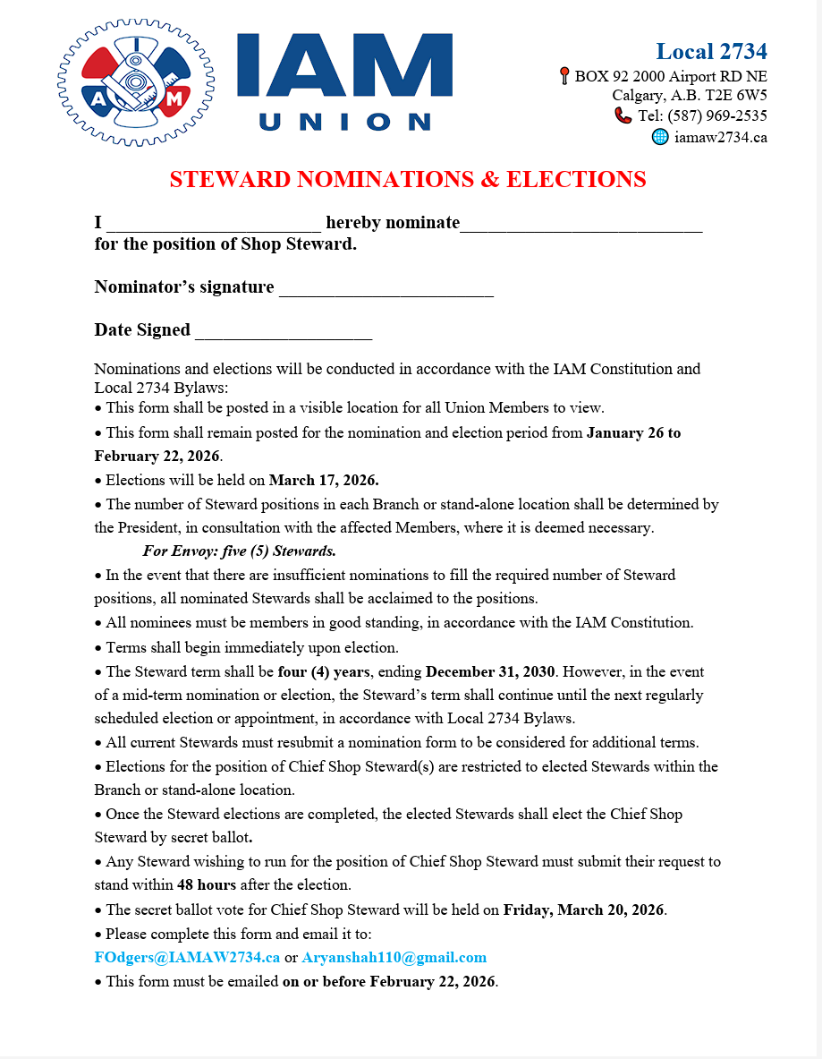 We encourage all members to review the nomination details, timelines, and requirements carefully, and to take part in shaping the leadership of IAM Local 2734.